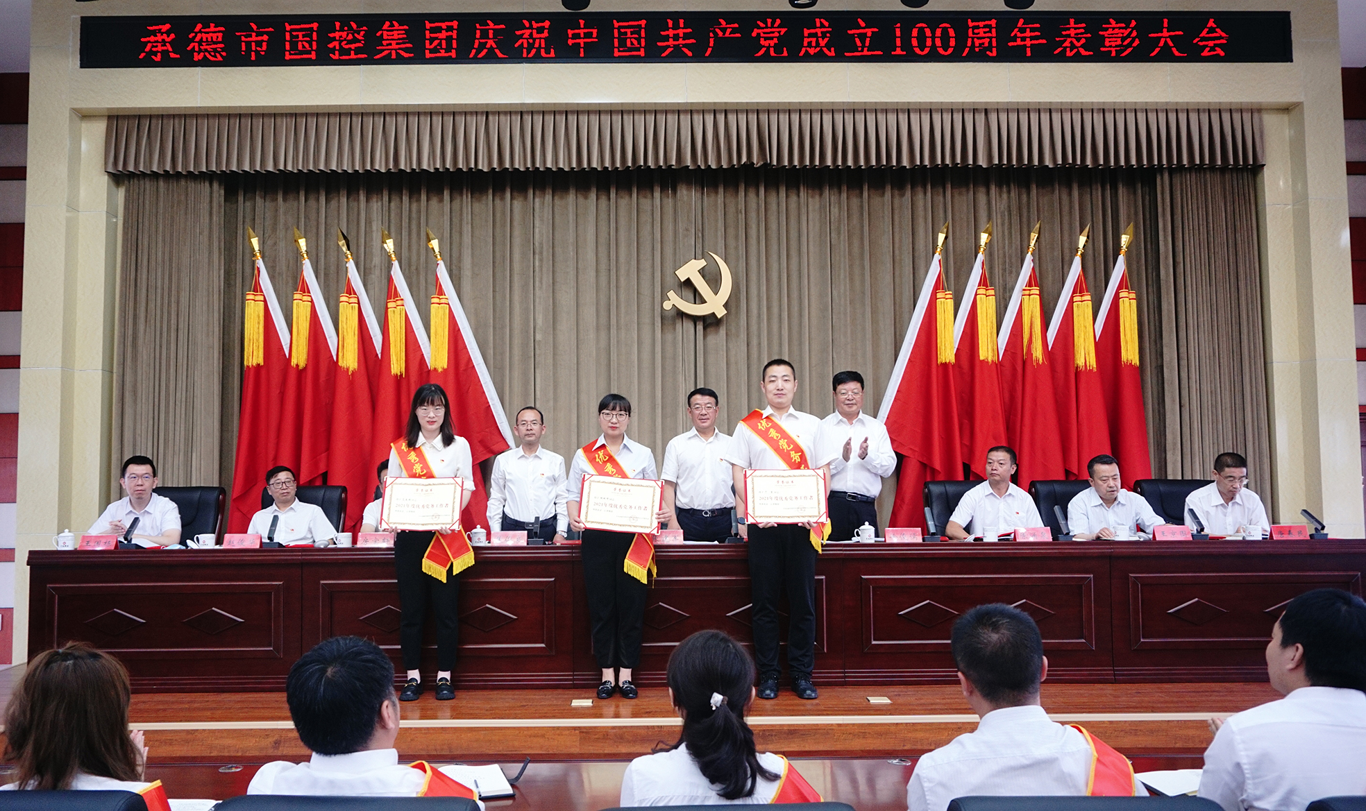 表彰大会气氛隆重热烈,大会在全场起立高唱国歌声中开幕。集团公司党委决定,授予许平凡等7名共产党员“优秀共产党员”称号,授予胡斌伟等3名党务工作者“优秀党务工作者”称号。现场向先进个人颁发了证书,并向参加“庆祝中国共产党成立100周年书画摄影大赛”获奖的人员颁发了荣誉证书。