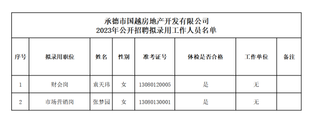 根据2023年度承德市国越房地产开发有限公司公开招聘工作人员的相关要求,经过笔试、面试、体检和考察等程序,确定袁天玮、张梦园2名同志为承德市国越房地产开发有限公司拟录用工作人员,现予以公示。公示期间如有异议,可通过电话、信函等方式反映,反映意见请署真实姓名。